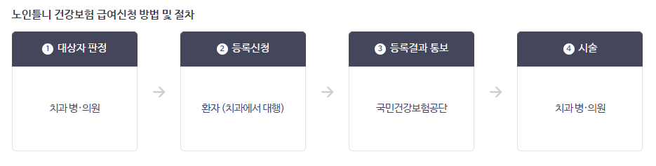 ✔ 먼저 원하는 치과 또는 국민건강보험공단 지사에 대상자로 등록을 요청하여야 합니다. 치과에 문의하시면 치과 측에서 등록 절차를 진행을 해 주시기 때문에, 가까운 치과에 방문하여 틀니 지원금 신청을 요청하면 쉽게 진행할 수 있습니다. 일반건강보험가입자 외에는 주민센터에 방문하여 문의하셔야 합니다.